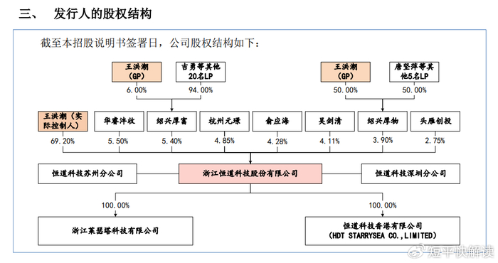 实控人表决权超78%。恒道科技控股股东、实际控制人均为王洪潮,直接持股比例为69.2%,其控制的绍兴厚富、绍兴厚物分别持股5.4%、3.9%,即王洪潮合计控制公司78.50%股权对应的表决权。