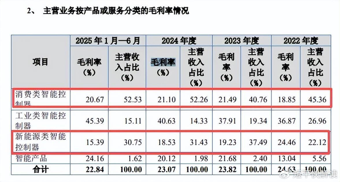 不过,主营业务毛利率总体呈现下滑态势,分别为24.63%、23.82%、23.07%、22.84%,主要是新能源类智能控制器毛利率连续下滑所致,从24.46%下滑至15.39%,累计下滑9.07个百分点,而消费类智能控制器波动较大,分别为18.85%、21.49%、21.1%、20.67%,即2023年以来呈现下滑态势。