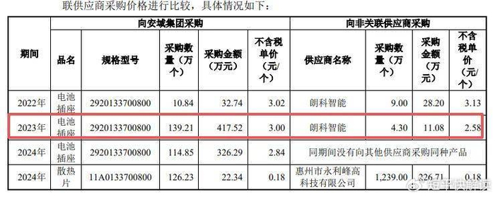 据披露,拓普泰克向安域集团采购电池插座、散热片等原材料,其中2023年采购数量为139.21万个,采购单价3元/个,采购金额417.52万元,而公司当年向朗科智能采购同类型产品单价为2.58元/个,相差0.42元,相同数量(139.21万个)、不同单价差额为58.4682万元。