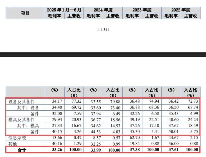 值得一提的是,设备及其备件、模具及其备件毛利率据呈现下滑态势,前者从36.42%下滑至34.17%,累计下滑2.25个百分点;后者从40.6%下滑至29.94%,累计下滑10.66个百分点,直接导致主营业务毛利率的下滑,从37.61%下滑至33.26%,累计下滑4.35个百分点。