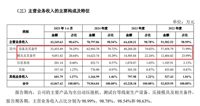 两大核心产品毛利率下滑。海昌智能主营业务收入主要由设备及其备件贡献,报告期实现收入分别为3.75亿元、4.83亿元、6.29亿元、3.34亿元,收入占比从71.99%上升至76.25%;模具及其备件收入紧随其后,分别为1.25亿元、1.45亿元、1.46亿元、0.91亿元,收入占比从23.99%下滑至20.64%。