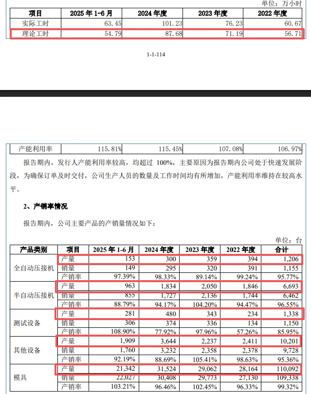部分产品产量波动大,产能消化连遭问询。2022年至2025年1-6月(报告期),海昌智能产能利用率分别为106.97%、107.08%、115.45%、115.81%,2024年理论工时为87.68万小时。