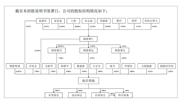 为何王焘没有签名?招股书显示,控股股东鹤壁聚仁共有11名股东,其中王焘持股比例最高,高达38%,间接持有海昌智能8.47%的股权,而董事长杨勇军在鹤壁聚仁的持股比例仅4.67%,间接持股比例1.04%,合计持股比例10.02%,略高于王焘。