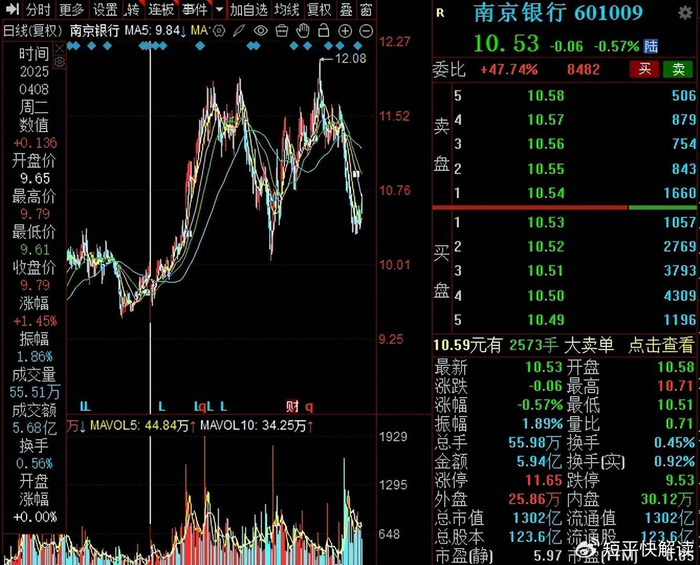 二级市场上,南京银行股价波动较大,2025年4月至今总体呈现“M形”走势,高点至12.08元/股(前复权,下同),此后迎来了较长时间的下跌,截至1月30日早盘收盘,股价为10.53元/股,较高点下跌约13%,总市值1302亿元,TTM市盈率6.05倍。