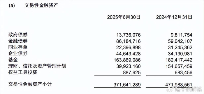 2025年中报显示,南京银行交易性金融资产为3716.41亿元,同比大幅减少1003.47亿元,降幅21.26%。分析来看,基金、理财、信托及资产管理计划分别为1638.69亿元、399.23亿元,同比分别减少185.48亿元、1147.34亿元。