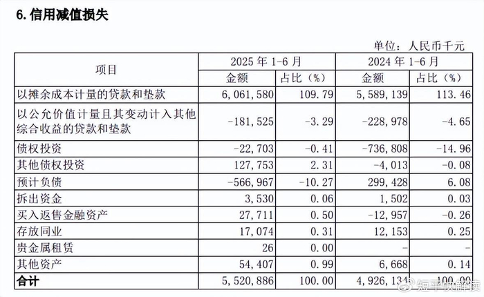 2025年中报显示,信用减值损失重头是以摊余成本计量的贷款和垫款,损失额为60.62亿元,同比增加4.72亿元,增幅8.45%。