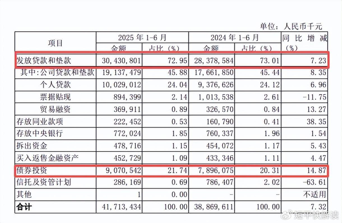 据短平快解读了解,公司同时期利息净收入增速分别为-0.49%、-5.63%、4.62%,去年前三季度同比增长28.52%至252.07亿元,这是总收入维持增长的关键。2025年中报显示,发放贷款和垫款利息收入为304.31亿元,同比增加20.52亿元,增幅7.23%,而债券投资利息收入为90.71亿元,同比增加11.74亿元,增幅14.87%,这是利息净收入大涨的关键。