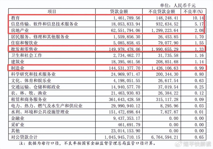 不良贷款率前三的行业分别是教育、信息传输、软件和信息技术服务业、房地产业,前两大行业分别为10.14%、5.17%,较上年末分别上升6.75个百分点,下滑0.75个百分点。