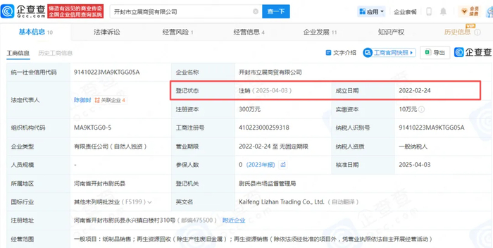 企查查显示,立展商贸成立于2022年2月,注册资本300万元,实缴资本10万元,参保人数均为0人,由陈御封全资持股,2025年4月3日注销。