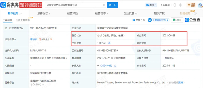 企查查显示,翌矿环保成立于2021年6月,注册资本为100万元(2025年11月之前为1000万元)实缴资本为0元,曹俊友、吴明伟分别持股60%、40%,参保人数均为0人。
