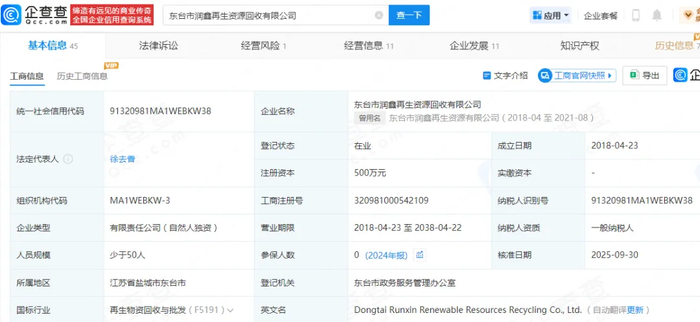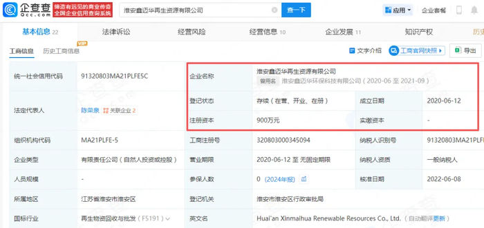 淮安汇嘉再生资源有限公司成立于2018年11月,注册资本为1000万元,实缴资本为0元,王金松、刘永红分别持股99%、1%,参保人数均为0人。