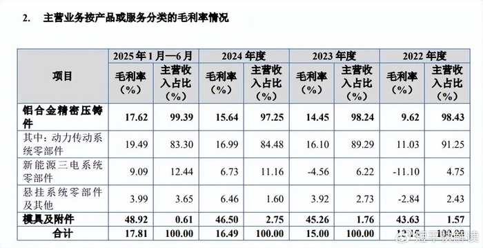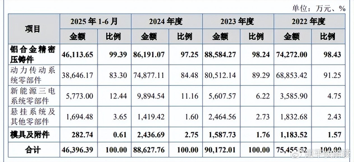 据短平快解读了解,主营业务收入主要来源于铝合金精密压铸件,报告期内分别为7.43亿元、8.86亿元、8.62亿元、4.61亿元,占比分别为98.43%、98.24%、97.25%、99.39%,包括动力传动系统零部件、新能源三电系统零部件、悬挂系统及其他零部件,期末收入分别为3.86亿元、5773万元、1694.48万元,占比分别为83.3%、12.44%、3.65%。