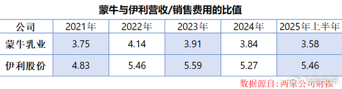以2025年上半年为例,伊利每投入1元销售费用,就能换来5.46元的营收;而蒙牛1元投入仅能撬动3.58元的营收,投入产出比差距一目了然。