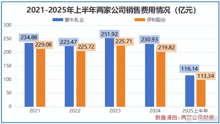 2021-2024年间,蒙牛的销售费用多数时候都高于伊利。2025年上半年依旧如此,当期蒙牛掏出116.14亿元用于营销推广,伊利则支出113.34亿元。