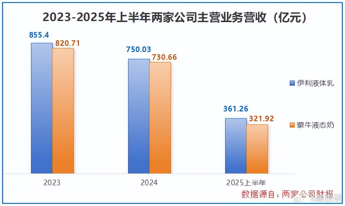 2024年,伊利液体乳营收从2023年的855亿元降至750亿元,同比下滑超100亿元;蒙牛液态奶收入也从821亿元缩水至731亿元,直接拉低了整体营收水平。