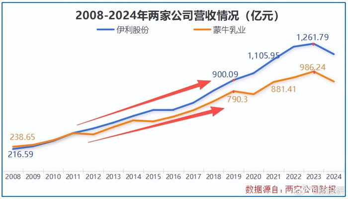 一步之差引发连锁反应,2019年之后,伊利和蒙牛的整体营收差距也越来越明显。