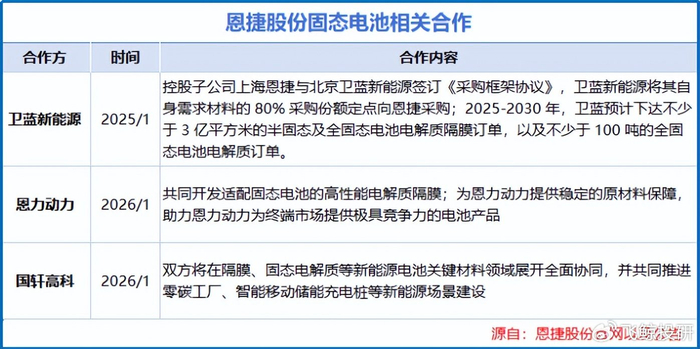 因此恩杰股份主动搭建多元化合作平台,2025年与卫蓝新能源签订采购协议,锁定了2025-2030年总计不少于3亿平方米固态电池隔膜和不少于100吨固态电解质的订单。