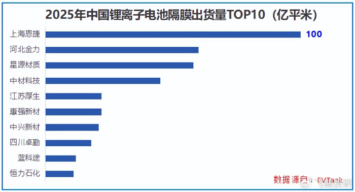 据EVtank统计,2025年恩捷股份隔膜出货量接近100亿平方米,以超30%的市占率连续八年稳居全国第一,把河北金力、星源材质等同行玩家甩在身后。