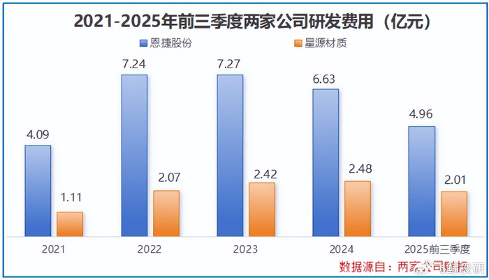 早在2021年,恩杰股份便成立控股子公司,主要研发硫化物路线的相关固态材料。并且,2022-2024年公司每年研发费用都稳定在7亿元左右,高于星源材质。