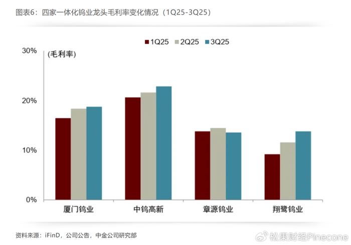 当然,抗周期往往意味着资源分散,而资源分散就代表很难吃到单一价格影响因素带来的弹性——厦门钨业2025年前三季度毛利率明显不如中钨高新,就是因为钨价暴涨时,专注于钨本身的中钨高新受影响更大。