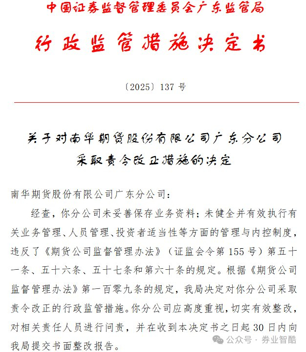 2025年11月19日,广东证监局连发三份红头文件,剑指南华期货股份有限公司(简称:南华期货)旗下广东分公司及两名责任人员。
