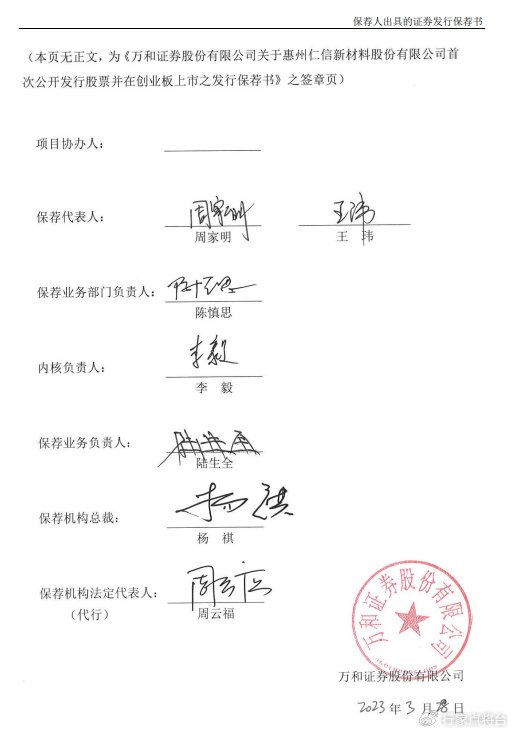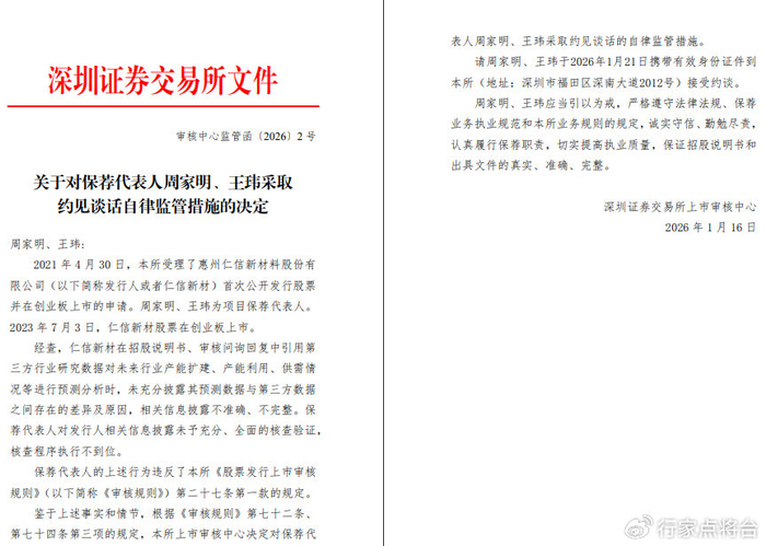 深交所红头文件直指万和证券保荐代表人周家明、王玮在仁信新材IPO项目中的执业瑕疵:发行人在招股说明书及问询回复中引用的第三方行业预测数据未充分披露与原始数据的差异及原因,导致信息披露不准确、不完整。作为保荐人,二人未对相关数据进行充分、全面的核查验证,程序执行不到位。