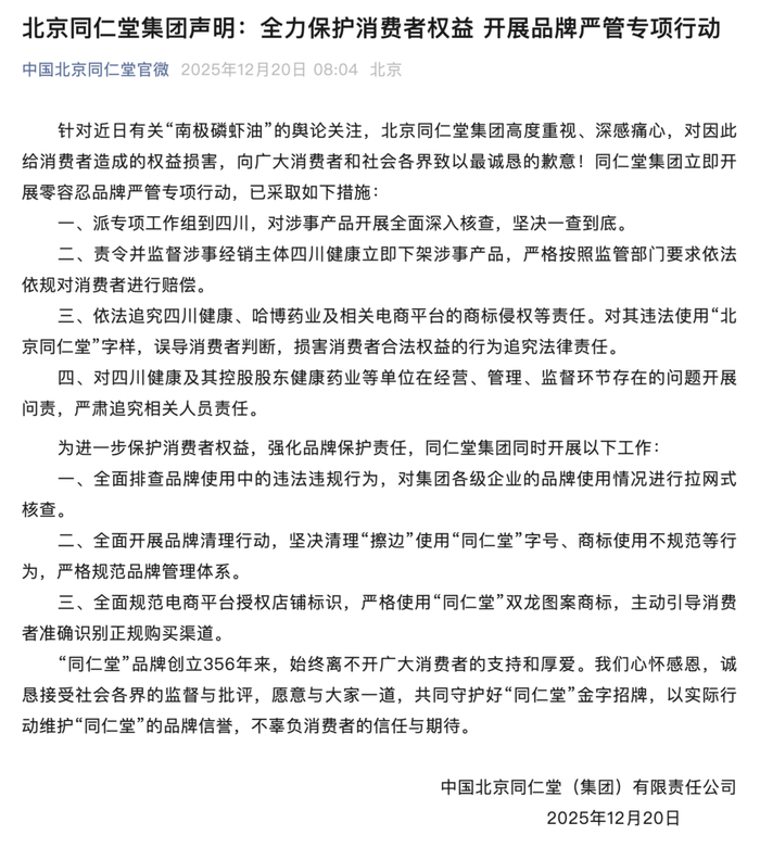 12月20日,北京同仁堂集团发布致歉声明称,针对近日有关“南极磷虾油”的舆论关注,集团对因此给消费者造成的权益损害,向广大消费者和社会各界致以最诚恳的歉意。