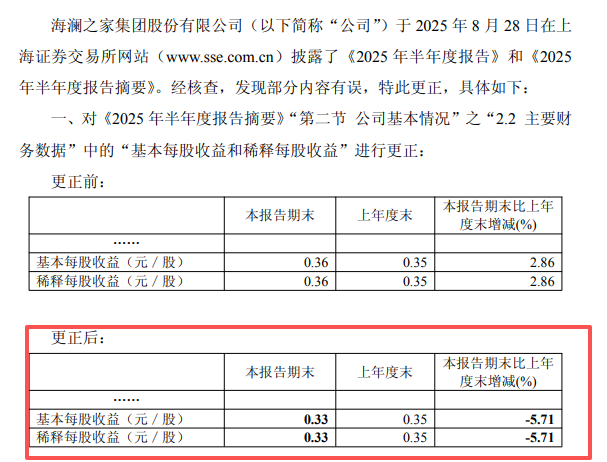 海澜之家在中报披露的次日发布更正公告称,经核查,发现部分内容有误,特此更正。具体包括对《2025 年半年度报告摘要》“第二节 公司基本情况”之“2.2 主要财务数据”中的“基本每股收益和稀释每股收益”等表格数据。