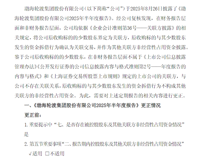 在8月25日披露中报后,渤海轮渡8月29日发布《关于前期定期报告的更正公告》,对2025年中报、2024年年报和2024年半年报的相关内容同时进行了更正。重要提示中“七、是否存在被控股股东及其他关联方非经营性占用资金情况”由“是”变为“否”。第五节重要事项“二、报告期内控股股东及其他关联方非经营性占用资金情况”由“适用”变为了“不适用”。