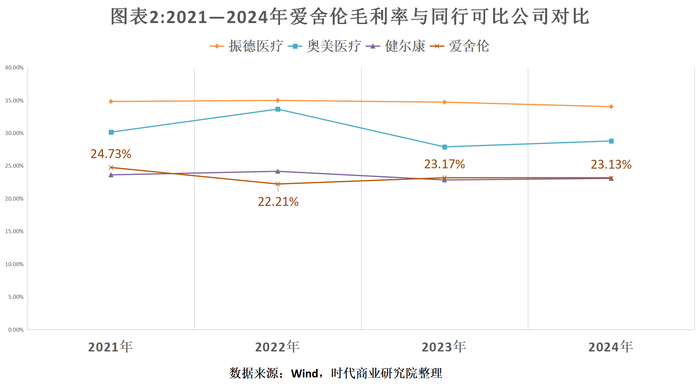 爱舍伦将奥美医疗(002950.SZ)、振德医疗(603301.SH)、健尔康(603205.SH)列为同行可比公司。Wind数据显示,2022—2024年,上述同行可比公司的营收同比增速均值分别为34.75%、-24.25%、8.39%,自2023年以来被爱舍伦反超。从单个企业来看,同行可比公司2023年的营收同比均下降,而爱舍伦仍逆势增长。