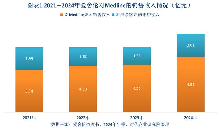 据时代商业研究院测算,2022—2024年,爱舍伦的营收同比分别增加了17.87万元、110.28万元、1.17亿元,同期,Medline对爱舍伦的采购额同比分别增加了3609.93万元、980.98万元、7111.13万元,是爱舍伦业绩增长的主要动力之一。