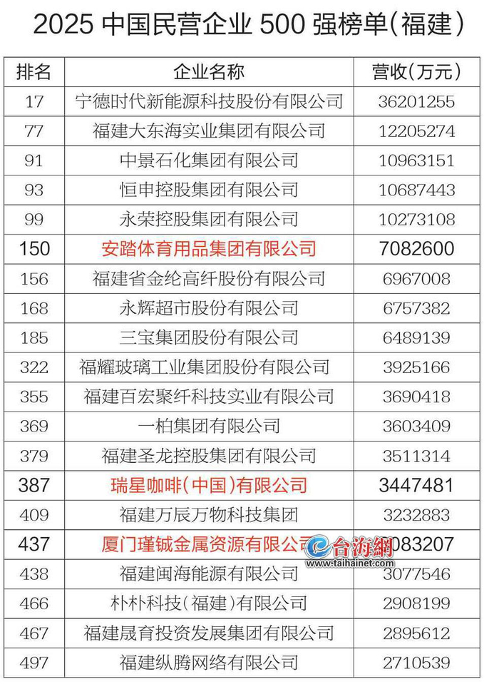 昨日,全国工商联在沈阳发布“2025中国民营企业500强”榜单。今年有20家闽企上榜,数量比去年增加6家,其中有5家闽企进入前百,宁德时代以3620.1255亿元营收位列第17位,也是福建全省第一。