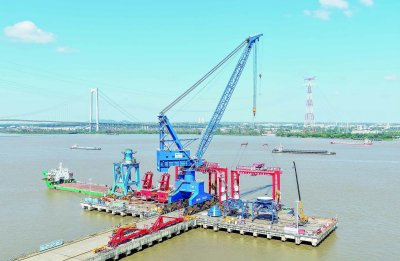 10月22日,南京经开区国家级制造业单项冠军企业南京港机重工制造有限公司龙潭基地,工人正在吊装发运全自动龙门起重机。公司为满足国内外客户需求,高效制造大型港口设备,截至目前,工业产值同比增7.4%,再创新高,正全力冲刺全年目标任务。