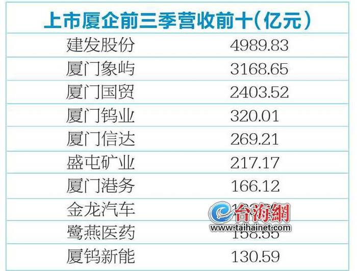 今年前三季度,厦门上市公司整体营收稳中有进。建发股份以4989.83亿元的营收成绩独占鳌头,厦门象屿和厦门国贸分别以3168.65亿元和2403.52亿元紧随其后,三家企业共同构成了厦门上市公司营收第一梯队。此外,还有8家上市公司营收超百亿,分别为厦门钨业、厦门信达、盛屯矿业、厦门港务、金龙汽车、鹭燕医药、厦钨新能、安井食品。