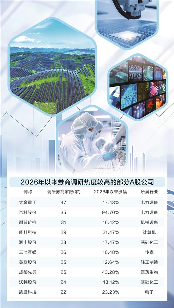按照券商调研家数统计,大金重工、帝科股份、耐普矿机、能科科技、润丰股份、三七互娱近期人气较高,均获得超25家券商扎堆调研。