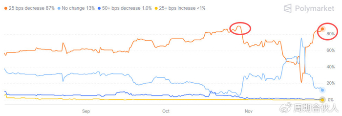 下面这张图很好地展示了近期市场的心路历程,从9月开始市场一致预期今年剩余的3次FOMC会各降25bp,后来鲍威尔嫌数据缺失认为市场定价过于一致,做了次预期管理,把12月的预期抹掉,到11月美股跌多了又回归降息交易: