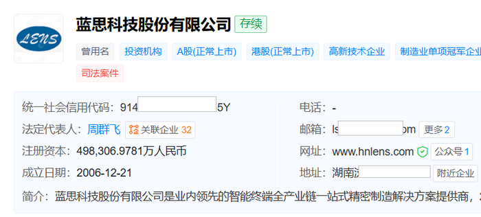 天眼查显示,蓝思科技成立于2006年12月,位于湖南省,2015年3月在深交所创业板上市,2025年7月在港交所上市。