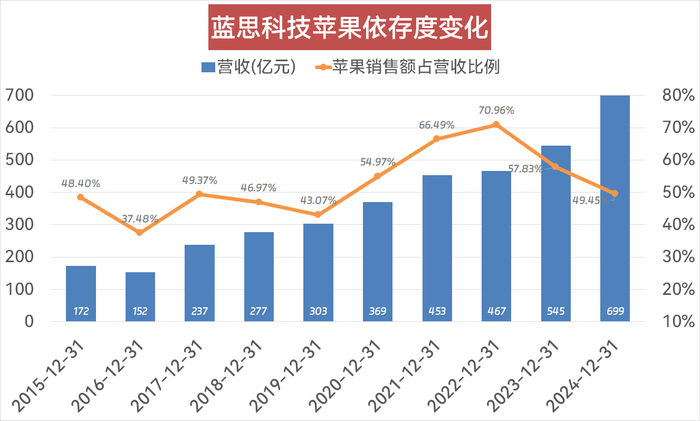 不过,和苹果的长期合作,也让蓝思科技产生了“苹果依赖症”。