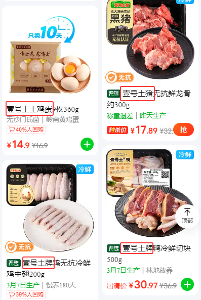图源:电商平台而在另一家生鲜APP上,生鲜猪肉类产品仍保留“壹号土猪”;鸡肉、鸭肉产品则标注为“壹号土牌”;一款鸡蛋产品的全称为“壹号土®土鸡蛋”,既有注册商标标识,又将“土”字保留在商品描述中。