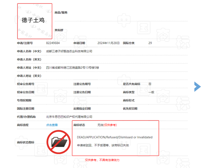 此外,《消费者报道》记者通过中国商标网查询发现,成都三德子好甄选农业科技有限公司申请注册的“德子土”商标专用权期限至2034年01月20日,而“德子土鸡”“德子土鸭”“德子土猪”商标均处于“无效”状态。