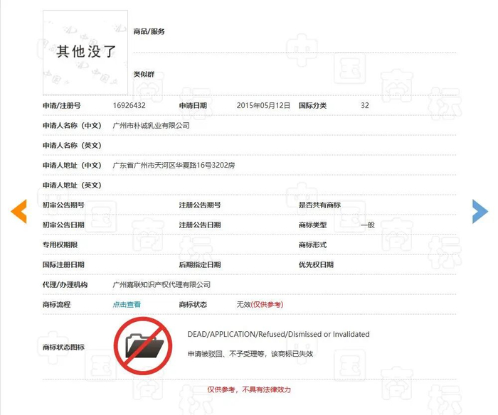 《消费者报道》查询中国商标网发现,广州市朴诚乳业有限公司此前申请的多个“其他没了”商标,目前均处于“无效”状态。