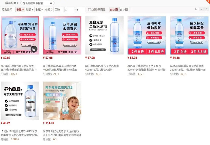 唯一一款国外水源地的产品——意大利 San Bernardo的ALPS阿尔卑斯饮用天然水——销量垫底,不足百份,与上述国内水源地产品数万级销量形成鲜明对比。