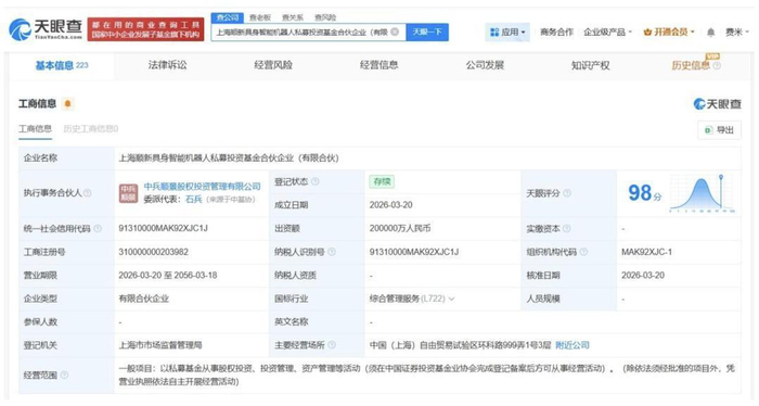 投资时间网、标点财经研究员同时注意到,近日,上海顺新具身智能机器人私募投资基金合伙企业(有限合伙)成立,执行事务合伙人为中兵顺景股权投资管理有限公司,出资额20亿人民币,经营范围为以私募基金从事股权投资、投资管理、资产管理等活动。