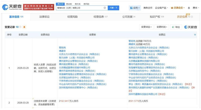 天眼查App显示,近日,智身科技(北京)有限公司发生工商变更,新增茅台(贵州)高质量成长股权投资合伙企业(有限合伙)、豪鹏科技(001283.SZ)等为股东,同时,注册资本由约2192.9万人民币增至约2501.6万人民币。