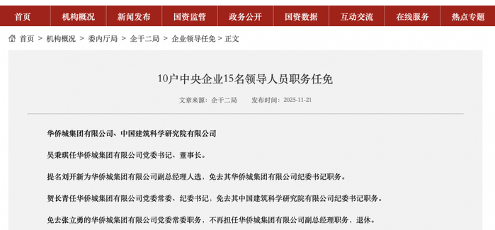 2025年11月21日,国务院国资委发布10户中央企业15名领导人员职务任免信息。