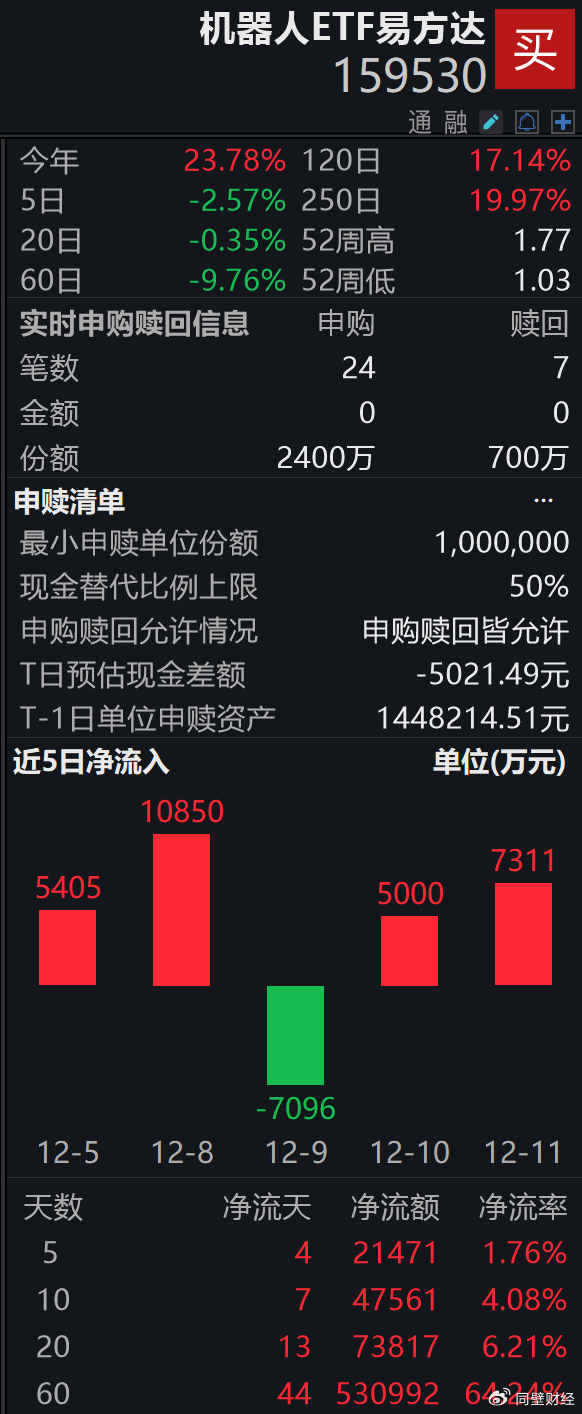 资金方面,机器人ETF易方达(159530)跟踪国证机器人产业指数,近10日吸金”超4.7亿,近60日获资金净流入超53亿;最新基金规模达124.42亿,为跟踪国证机器人指数的ETF基金中,唯一规模破百亿元。截至发稿,机器人ETF易方达(159530)盘中获净申购1700万份。