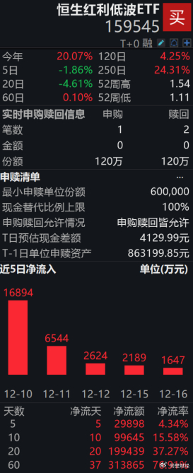 恒生红利低波ETF(159545)紧密跟踪恒生港股通高股息低波动指数,该基金备受资金关注,近5日资金净流入超2.9亿,近10日资金净流入近10亿,近20日资金净流入近20亿。
