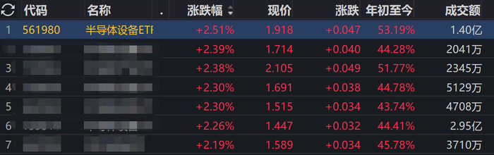 截至午盘,三大指数翻红,热门国产替代品种半导体设备ETF(561980)收涨2.51%,上午涨幅位居同类可比ETF第一,成交额高达1.4亿。成份股方面,金海通大涨8%,中科飞测大涨7.90%,长川科技、拓荆科技涨超5%,京仪装备、中微公司、芯源微涨超4%,华海清科、北方华创等多股强势跟涨。