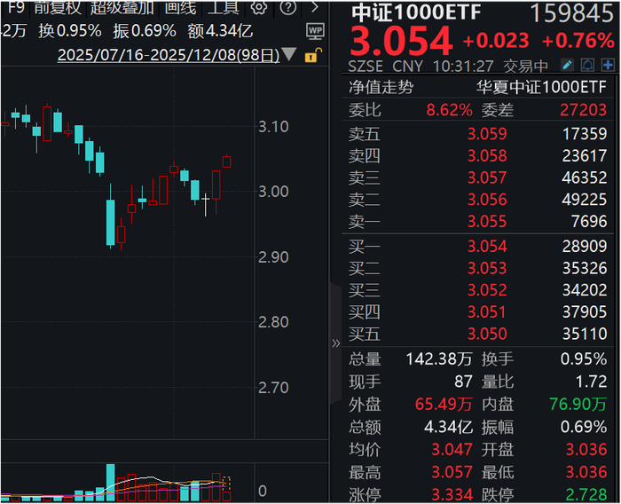 行业表现来看,中证1000ETF(159845)前几大重仓行业中,电子上涨1.94%,电力设备上涨1.10%,医药生物上涨0.39%,计算机上涨1.60%,机械设备上涨0.98%。