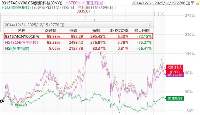 覆盖“中国十大科技股”(阿里巴巴、京东集团、吉利汽车、比亚迪股份、小米集团、腾讯控股、网易、百度集团、美团和中芯国际)的港股科技指数(931574)相对恒生科技指数表现更优。港股科技指数(CNY)自基日2014年12月31日至2025年12月15日,累计涨幅99.23%,同期恒生科技指数涨幅83.28%。